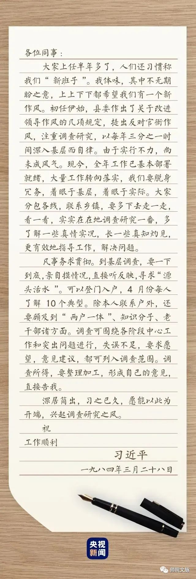 3月底的一天,河北正定县委、县人大常委会、县政府、县政协四大班子领导成员,同时收到一封内容相同的信。信中,“注重调查研究”“着眼于基层,着眼于实际”“实实在在地调查研究一番”,言之切切。接到这封信,正定四大班子领导都坐不住了。“习书记这回较真了啊!”
