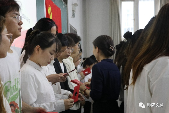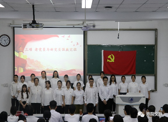 随后,在新发展党员入党宣誓仪式上,新党员列队整齐,由老党员为新党员佩戴党徽,激励他们不忘初心,砥砺前行,把党的光荣传统和优良作风铭记于心、践之于行,实现党的事业薪火相传。新党员面对党旗庄严宣誓,要始终保持对党绝对忠诚,坚定理想信念,忠于党的事业。2021级学生邱瑞代表新发展党员发言,表示了对党组织培养和教育的感激之情,也表明了“做合格党员,永远跟党走”的信心与决心。2020级学生党员董子业、于杰分别代表老党员发言,号召大家要不断武装头脑,增强党性修养,严于律己,继承和发扬党的优良传统,以良好表现回报党组织的培养和关怀,真正发挥党员的先锋模范作用。最后,庞曦副书记对党员们提出要求:一是要以认真落实政治理论学习为基础,牢记身份,做党的创新理论坚定的学习者和践行者;二是要以坚持中国共产党的领导、坚持走中国特色社会主义道路为根本,深刻理解坚持党的领导是中国特色社会主义最本质的特征;三是要以全心全意为人民服务这一宗旨为行动指南,积极服务群众、奉献社会。