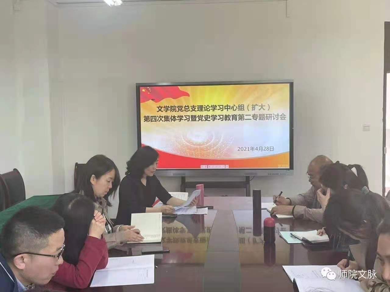 4月28日下午,文学院党总支召开理论学习中心组(扩大)第四次集体学习暨党史学习教育第二专题研讨会,聚焦社会主义革命和建设时期历史,围绕“以史明志”专题进行交流研讨。会议由学院党总支书记杨阳主持。