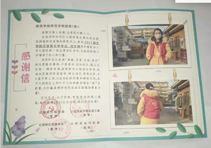 (一)参与社区服务,发挥榜样作用。支部鼓励学生党员在科学防护的前提下积极参与疫情防控志愿服务,充分发挥党员的先锋模范作用。2017级学生党员肖文婷在寒假期间踊跃参与居住地所在社区一线志愿者服务,协助社区摸排外来人员信息,测量体温,对重点场所进行消毒,参与防控宣传安全等,充分发挥“奉献、有爱、互助、进步”的志愿服务精神,不畏艰险,逆向而行,服从社区的工作调度安排,用自己的实际行动助力防疫工作,以良好的自身形象和模范行动践行了一名共产党员的初心使命。