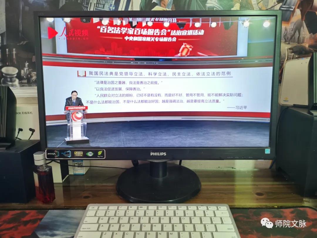根据学校统一安排,7月29日下午,文学院党总支组织全体师生以不同形式通过人民网在线收看了“双百”活动专场报告会,聆听了中国法学会党组成员、学术委员会主任张文显作的主题为“宣传贯彻《中华人民共和国民法典》”的专场报告。