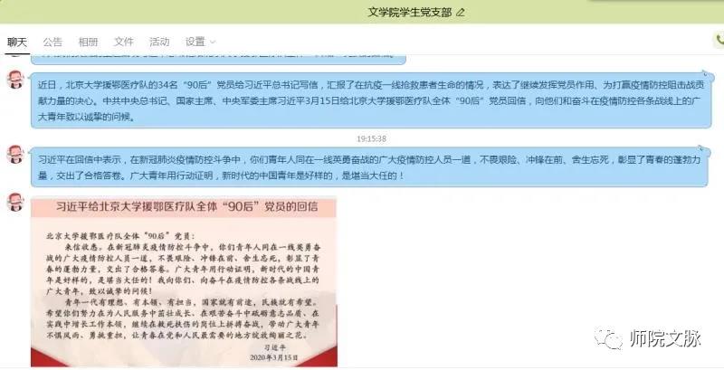 “青年一代有理想、有本领、有担当,国家就有前途,民族就有希望。”近日,习近平总书记给北京大学援鄂医疗队全体“90后”党员回信,向他们和奋斗在疫情防控各条战线上的广大青年致以诚挚的问候,引起广大青年的热烈反响。3月20日,文学院学生党支部在支部书记王黎的带领下对回信进行了线上学习交流。