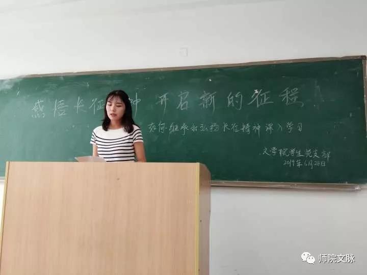 活动中,文学院学生党支部书记王黎讲授了题为《如何继承和弘扬长征精神》的主题党课。她通过讲述中国共产党的奋斗历程,红军二万五千里长征之路,让学生党员真切的感受到红军长征的艰辛,体会到红军战士对革命理想事业无比的忠诚、坚定的信念,不怕牺牲、敢于胜利的无产阶级乐观精神以及顾全大局、严守纪律、亲密团结的高尚品德。她教育和鼓励学生党员要继承和弘扬长征精神,将理想信念作为精神支柱,将艰苦奋斗作为立身之本,将积极乐观作为力量之源,将集体主义精神牢记心中,开启新的征程,走好新长征之路。