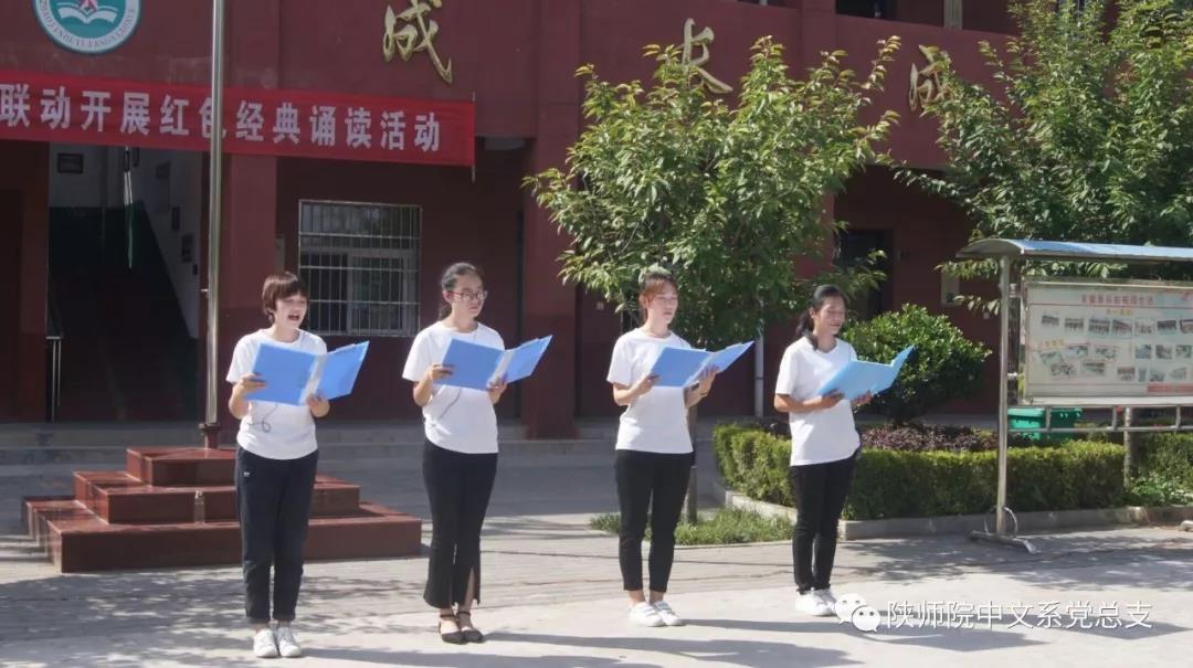 活动在北梁红军小学学生精彩生动的朗诵声中拉开序幕。北梁红军小学副校长陶建刚致欢迎辞。陕西省教学能手朱华老师声情并茂地朗诵了《丰碑》,陕西省教学能手邵敏老师和我系学生慷慨激昂地朗诵了《七律•长征》,我系学生还深情朗诵了《狼牙山五壮士》和《红色的照金》。炎炎酷暑丝毫不能影响师生们的诵读热情,一篇篇的红色经典,将“红色基因”深深融入师生们的血脉之中,将红色精神转化为前进的动力。