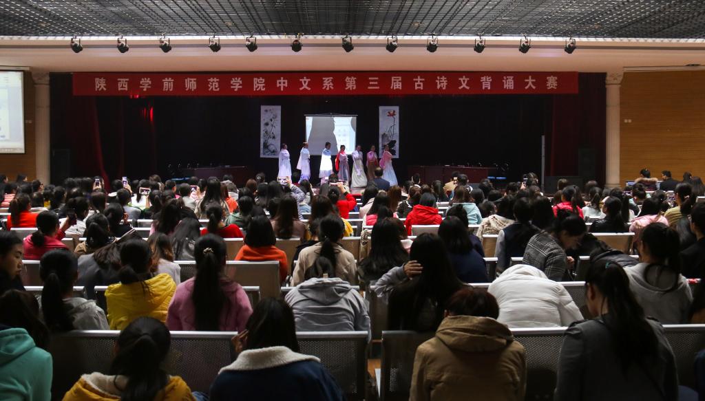 11月16日,中文系第三届古诗文背诵大赛决赛在校学生活动中心隆重举行。决赛邀请中文系马晓琴教授、陕艳娜副教授、学前教育系副书记文竹、计算机与电子信息系副书记黄薇、中文系副书记孔养涛、校团委副书记薛腾以及外语系彭莉老师担任评委,参赛院系共计500余名学生观看了比赛。
