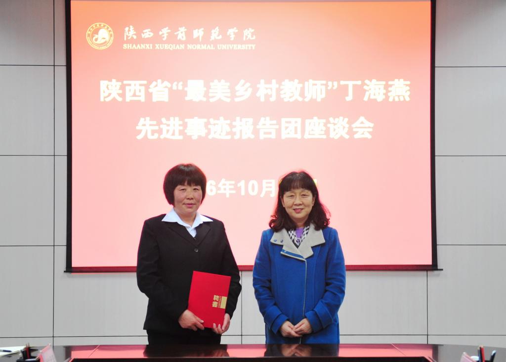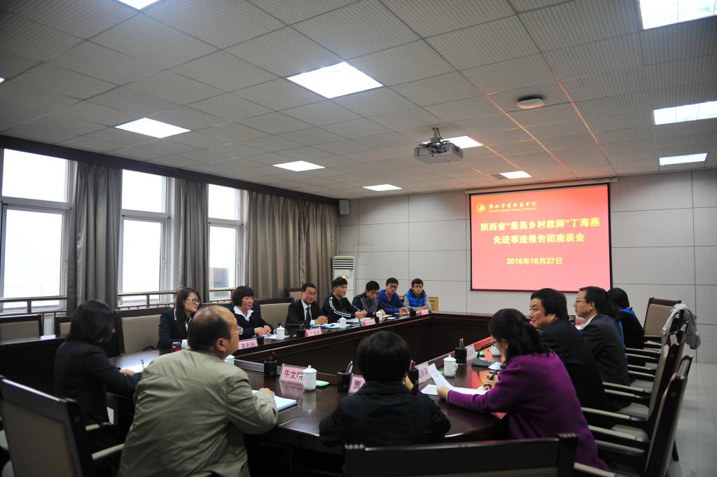 10月27日,陕西“最美乡村教师”丁海燕先进事迹报告团座谈会在我校举行,旬邑县教育局党委副书记、纪委书记吴卫国,报告团成员第五广平、高利利、丁海燕,我校党委书记付建成,副校长相艳出席座谈会,党政办公室、人事处、教务处、中文系相关负责人及师生代表参加座谈会,栾高明副书记主持座谈会。