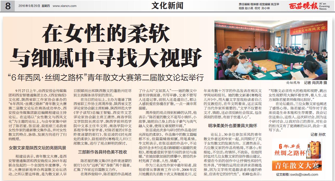 青年散文大赛是《西安晚报》从2015年发起的一个全国性年度赛事,旨在为散文新人早日脱颖而出和陕西散文的蓬勃兴旺创设良好平台。中文系师生通过参与本次活动,开阔了视野,展示了良好风貌。