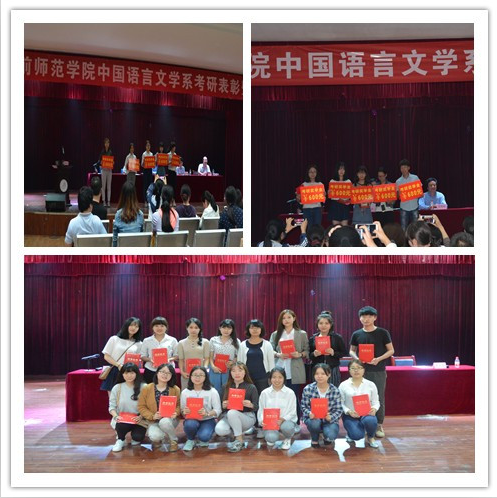 在大会表彰阶段,系主任牛文明宣读了中文系对2012级汉语言文学专业考取研究生的17位同学的表彰决定。在激昂的乐曲声和热烈的掌声中,与会领导为考研学生颁发了荣誉证书、奖金和奖品。考研获奖学生代表杨燕、教师代表胡世强博士、2013级学生代表杨欢分别发言。