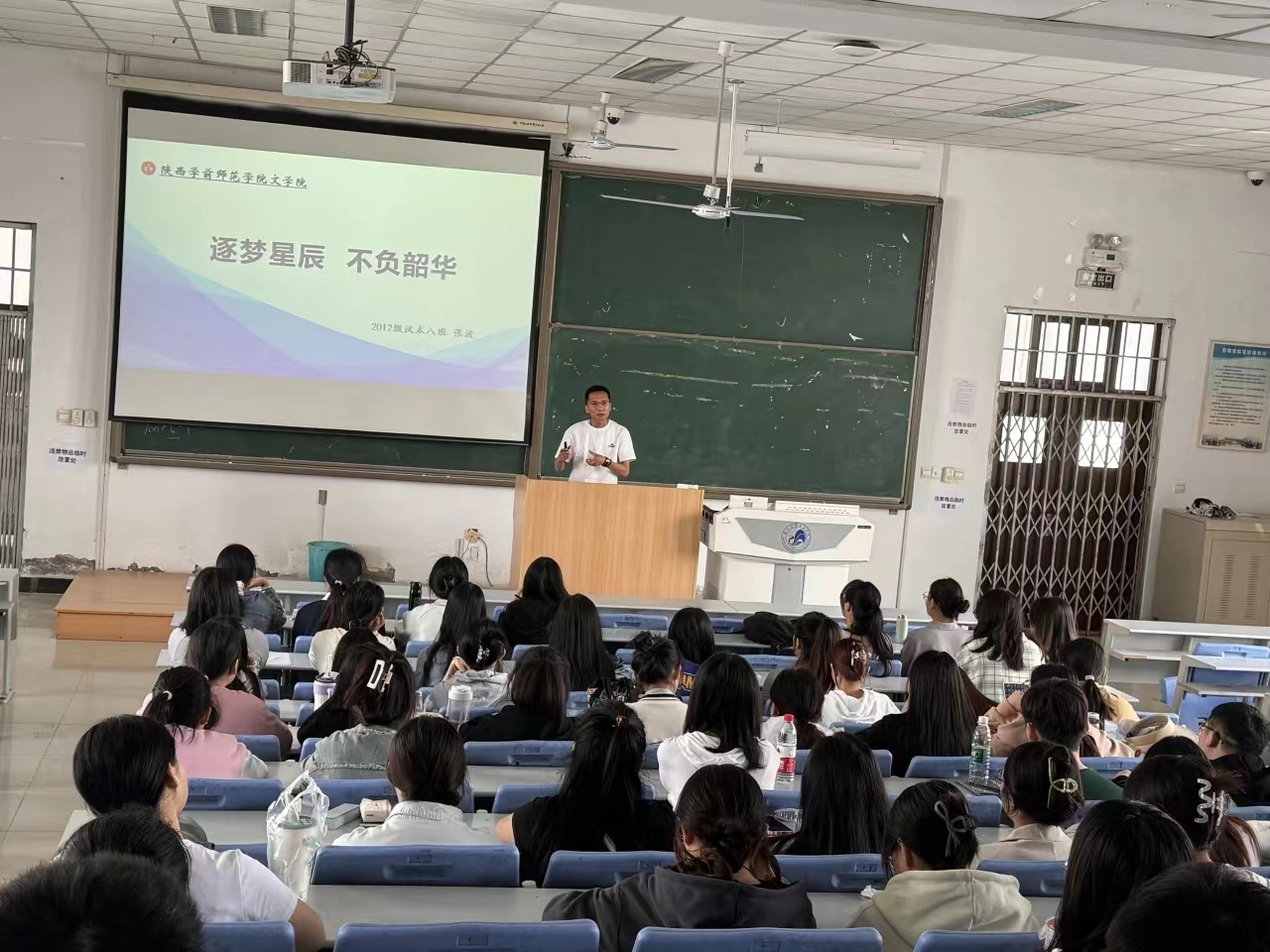 2024年4月11日下午两点,文学院在博文楼C4阶梯教室举办“校友讲堂”第二讲,邀请到延安市中小学教学能手、文学院2016届优秀毕业生张波主讲。文学院党委副书记庞曦、毕业班辅导员康乐和137名应届毕业生共同参与了活动。康乐老师担任本次活动主持。