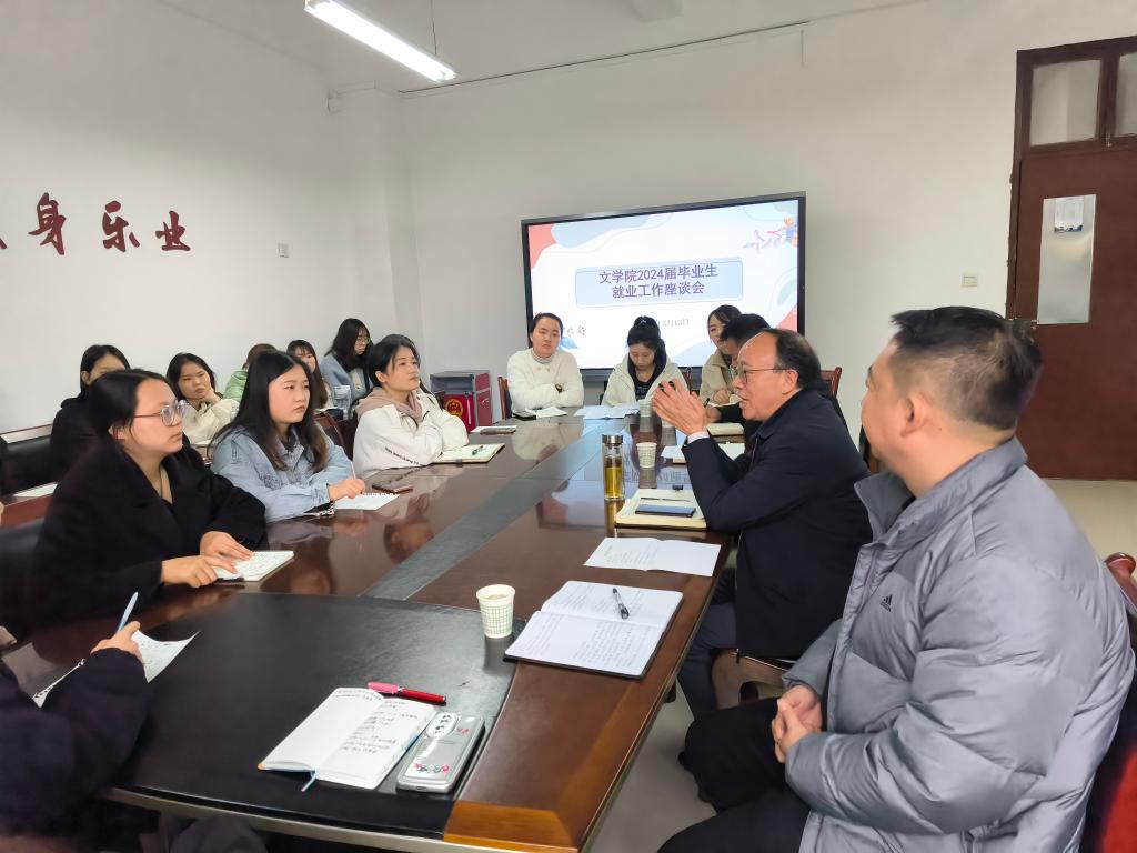 为进一步贯彻落实学校关于2024届毕业生就业工作的安排部署,全力做好毕业生的就业指导与服务工作,3月13日下午,文学院在学院会议室召开2024届毕业生就业工作座谈会。校党委副书记唐宏与文学院党委书记赵淼、院长牛文明、学工部副部长王成富、毕业班辅导员康乐以及24名学生代表共同参加了会议。会议由文学院党委副书记庞曦主持。