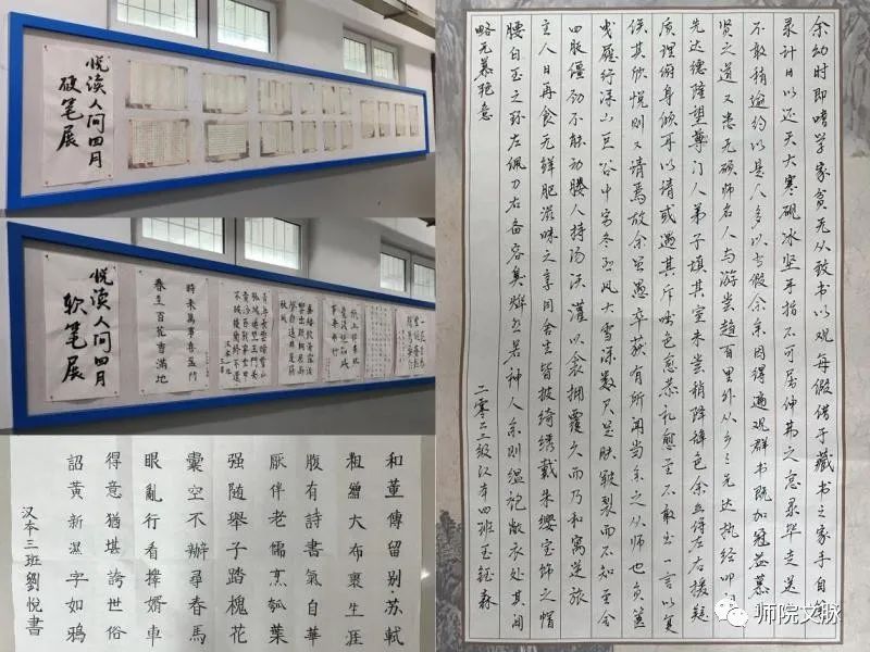 4月下旬,文学院面向大一学生开展“悦读人间四月”系列活动之书法比赛。同学们积极参与,用心书写,书法作品或苍劲有力,或隽永飘逸,充分展示了同学们较高的书法水平。本次活动共征集到48份书法作品,分为软笔书法和硬笔书法两类,内容主要是有关“读书”、“书籍”的名言佳句和古今中外经典文学作品摘录。经过初赛、复赛层层选拔和严格评审,最终有20件书法作品脱颖而出,评选出一等奖3份,二等奖5份,三等奖12份。“观其字,知其人”,通过本次书法比赛活动,充分激发了学生们的书写热情,有效提升了书法基本功和自身修养,进一步弘扬了中华传统文化,营造了良好的校园文化氛围。