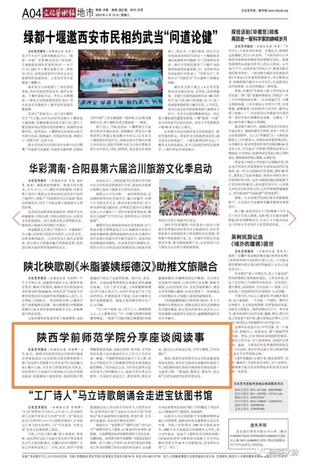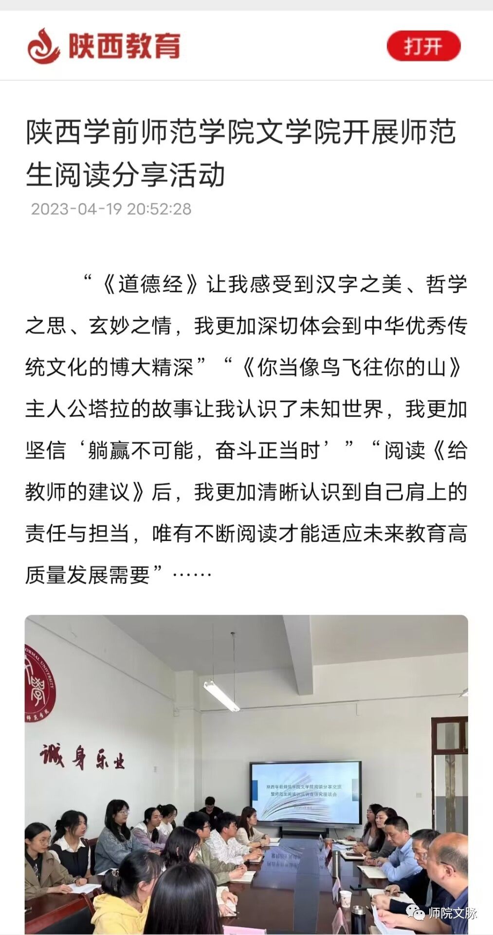 会上,杨阳书记介绍了开展本次活动的目的与意义,鼓励学生以本次活动为契机,争做“爱阅读、善表达、勤思考、肯实践”的文学院优秀学子。十四位参会师范生敞开心扉,深入交流分享了自己的阅读体会与收获以及个人阅读中出现的碎片化时间导致浅阅读、短视频侵占阅读时间、阅读经典不易理解、个人偏好制约阅读广度等诸多困惑,并对推进书香校园建设提出了自己的想法与建议。王俊玉馆长、黄海涛副部长分别结合自己的工作分工与阅读经历为学生们答疑解惑,并从自身的角度阐释了阅读的重要意义,鼓励同学们积极阅读,并通过自己影响和带动身边的人投入阅读,为推进书香校园建设贡献力量。最后,牛文明院长对师范生阅读提出殷切期盼,“永怀高远之志,为中华民族伟大复兴而读书;常怀敬畏之心,汲取中外优秀文化精华。在阅读中遇见自己、遇见家国、预见未来。通过自己的阅读示范,为学生蓄能,为生命燃灯”。通过师生交流和老师的谆谆教诲,参会学生纷纷表示,读书不但是提升自我、浸润心灵的途径,更是师范生担负起未来教师神圣使命与担当的迫切需求,他们将坚持阅读,努力为祖国播下更多“读书的种子”。本次座谈会受到了社会广泛关注,《文化艺术报》《陕西教育》等媒体对此进行了宣传报道。