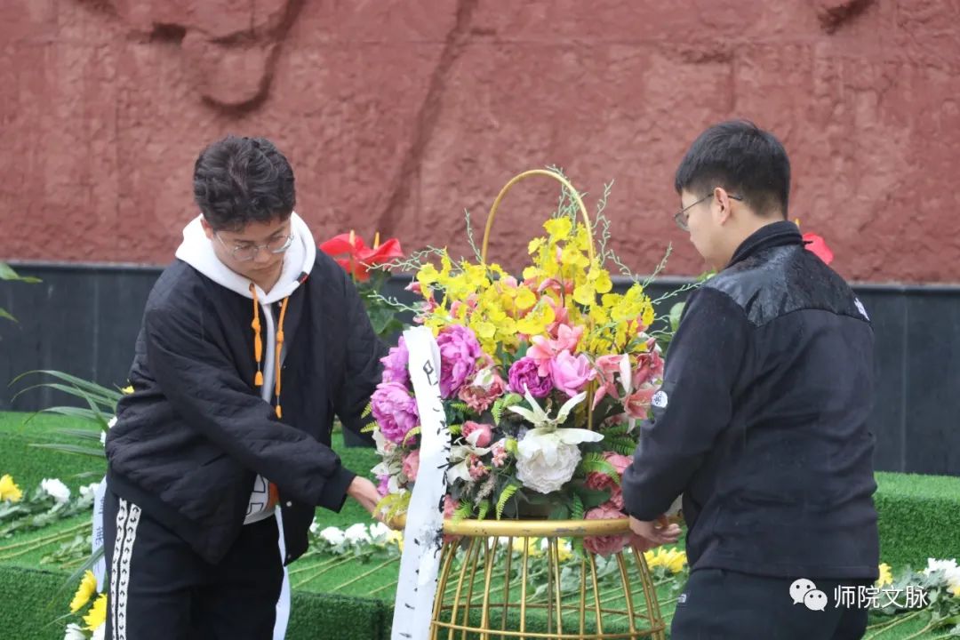 烈士陵园松柏苍翠,浮雕广场庄严肃穆。下午3时许,师生们怀着虔敬的心情,冒雨在纪念碑前整齐列队,向英勇献身的烈士默哀。学生党员代表陈茉同志诵读祭文,表达了后辈对英烈深切的缅怀追思之情及崇高敬意。随后,2名团员代表缓步走向烈士纪念墙,向烈士敬献花篮,康乐老师上前整理挽联。最后,全体师生鞠躬致敬,深切缅怀革命先烈的不朽功绩和用血与肉铸成的不朽丰碑。