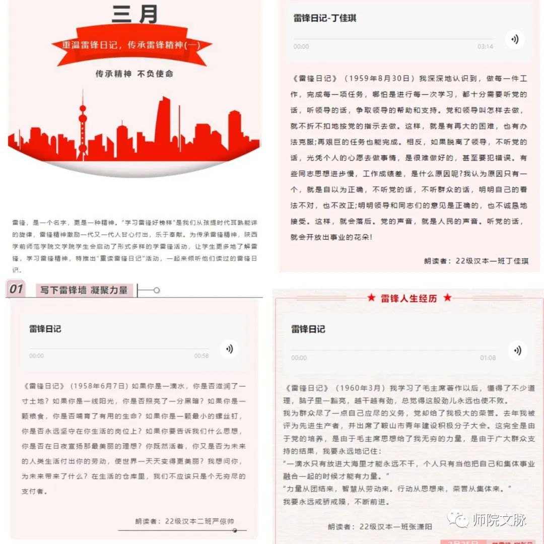 3月中旬,文学院团总支组织开展《雷锋日记》主题诵读活动,鼓励同学们积极重温《雷锋日记》,深刻领悟雷锋精神的时代内涵和实践要求,并通过视频与音频的形式记录下学生们对于雷锋事迹与精神的真挚言语和感动之情。此次活动进一步激励着青年学子们从模范榜样中汲取奋进力量,感受雷锋无私奉献精神和伟大的爱国主义情怀,增强建设社会主义现代化新征程中的青春担当。