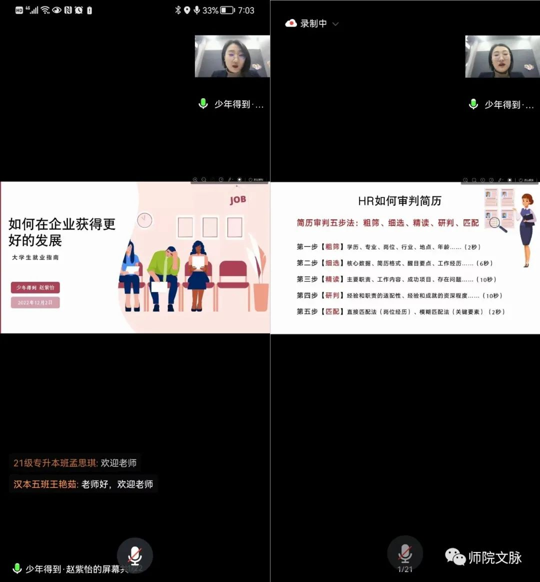 12月2日晚,文学院通过腾讯会议平台组织开展第三期毕业生就业能力提升训练营第三场讲座并进行了企业招聘宣讲。本次活动邀请少年得到招聘负责人赵紫怡进行宣讲,有170余名2023届毕业生参与本次活动,活动由文学院党委副书记庞曦主持。活动中,赵老师以《如何在企业获得更好的发展》为题,从“如何拿到理想的offer”和“如何在企业良好发展”两方面进行讲授。她从HR招聘工作的角度重点讲授了简历制作和面试技巧,包括简历制作的原则、基本要素和制作技巧,面试前的准备、面试中的策略、面试礼仪和常见问题的回答技巧。同时,她围绕个人在企业就职过程中的职业规划,指导同学们如何“梳理正确的职场思维”、“储备充足的职场燃料”,以及不断进行“评估职业价值”促进个人职业发展。讲座结束后,赵老师代表所在企业少年得到进行了招聘宣讲。她详细介绍了该企业的发展历程、企业文化、员工晋升渠道、企业待遇福利等情况以及本次招聘岗位的名称、条件要求,诚挚邀请同学们积极应聘。