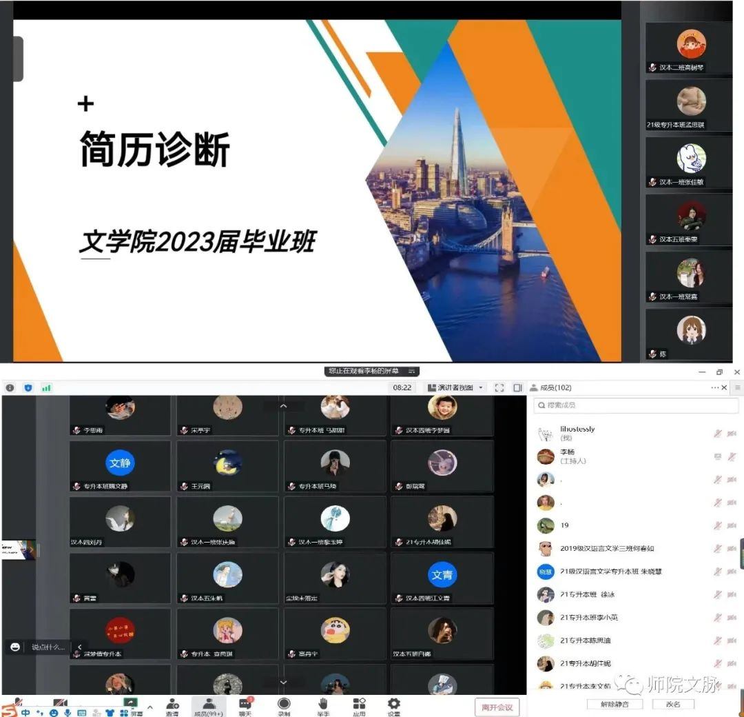 12月16日上午,文学院举办“就业能力提升训练营”第四场讲座——“简历诊断”,由2023届毕业生班辅导员李杨、李怡通过腾讯会议平台主讲,共有100余名毕业生参加活动。活动中,李杨老师针对简历的要素、类型和制作内容进行了详细讲解,她推荐学生在简历制作中使用STAT法则,突出个人目标岗位适配能力。她还详细介绍了简历制作的五步法,包括自我能力澄清、目标岗位分析、做好人岗匹配、搭建逻辑框架和增强语言表现力,以帮助同学们快速提升简历制作水平。李怡老师针对目前收集的学生简历进行点评和分析,重点针对学生简历中出现的错别字、格式排版、重点不突出以及教育背景缺失等问题,逐一进行了指导,提出修改建议,她希望同学们在简历制作中要明确个人求职意向,内容重点突出求职单位要求学生具备的能力,并做好其他证明材料的准备。