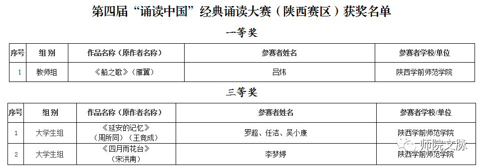 近日,陕西省教育厅公布了第四届“诵读中国”经典诵读大赛(陕西赛区)评选结果。文学院吕炜老师荣获教师组一等奖,2020级汉语言文学三班罗超、2020级汉语言文学四班李梦婷荣获大学生组三等奖。