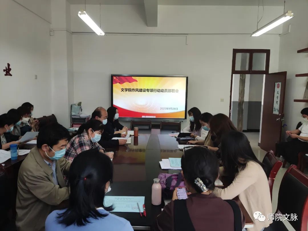 为全面贯彻落实学校党委工作部署,推动学院作风建设专项行动深入开展,9月28日下午,文学院在博文楼A211会议室召开作风建设专项行动动员部署会,全面动员和安排部署作风建设工作。文学院领导班子、全体教工党员参加会议。会议由学院党委副书记庞曦主持。