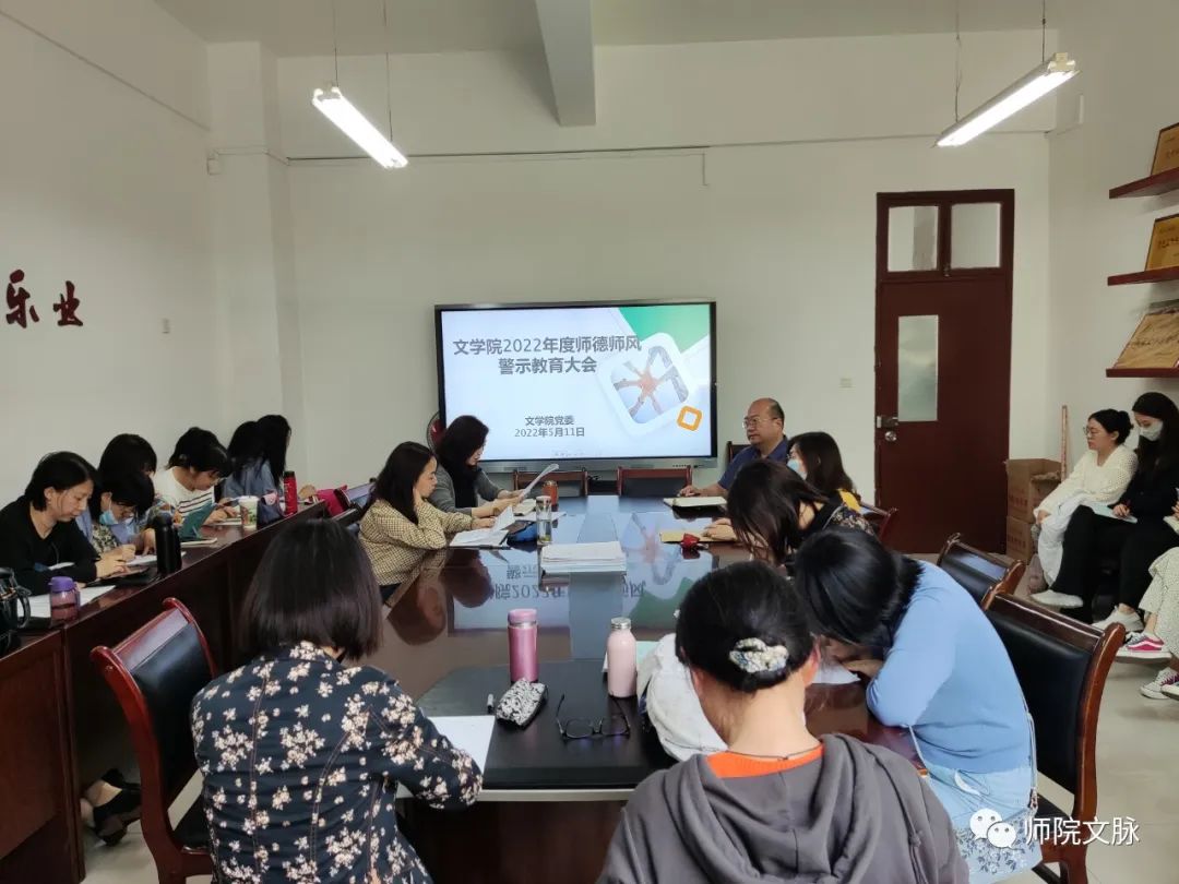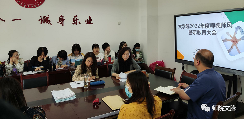 为进一步加强师德师风建设,树师德、正师风,5月11日中午,文学院在博文楼A211会议室组织召开2022年度师德师风警示教育大会,全体教职工参加会议。会议由学院党委书记杨阳主持。