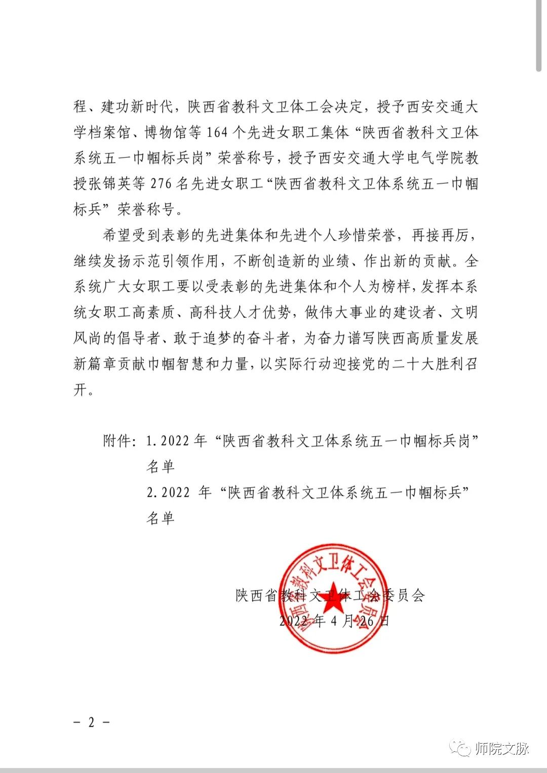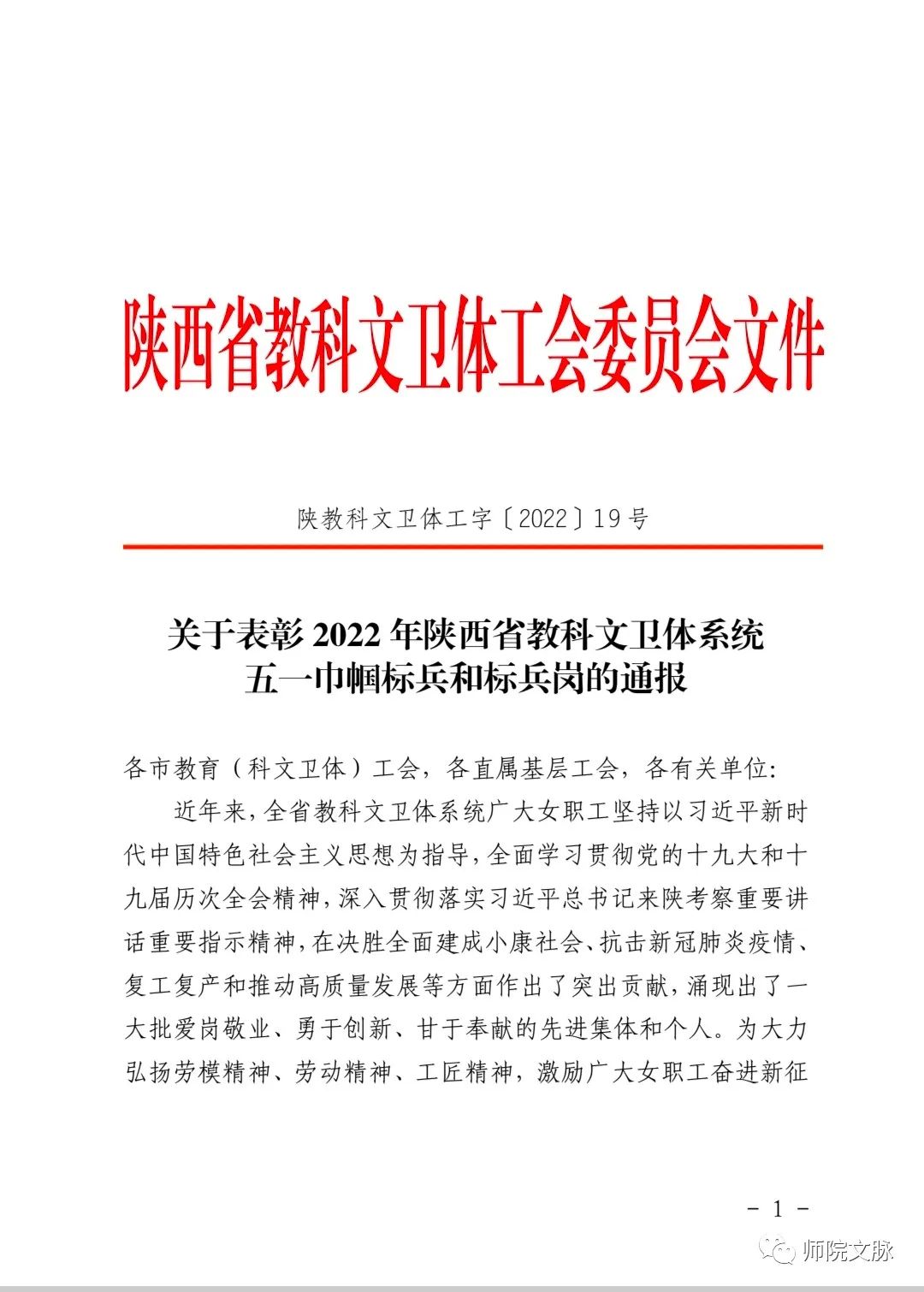 4月26日,陕西省教科文卫体工会委员会发布《关于表彰2022年陕西省教科文卫体系统五一巾帼标兵和标兵岗的通报》(陕教科文卫体工字〔2022〕19号),通过层层申报、审核、公示,我院语言学教研室获评“陕西省教科文卫体系统五一巾帼标兵岗”荣誉称号。