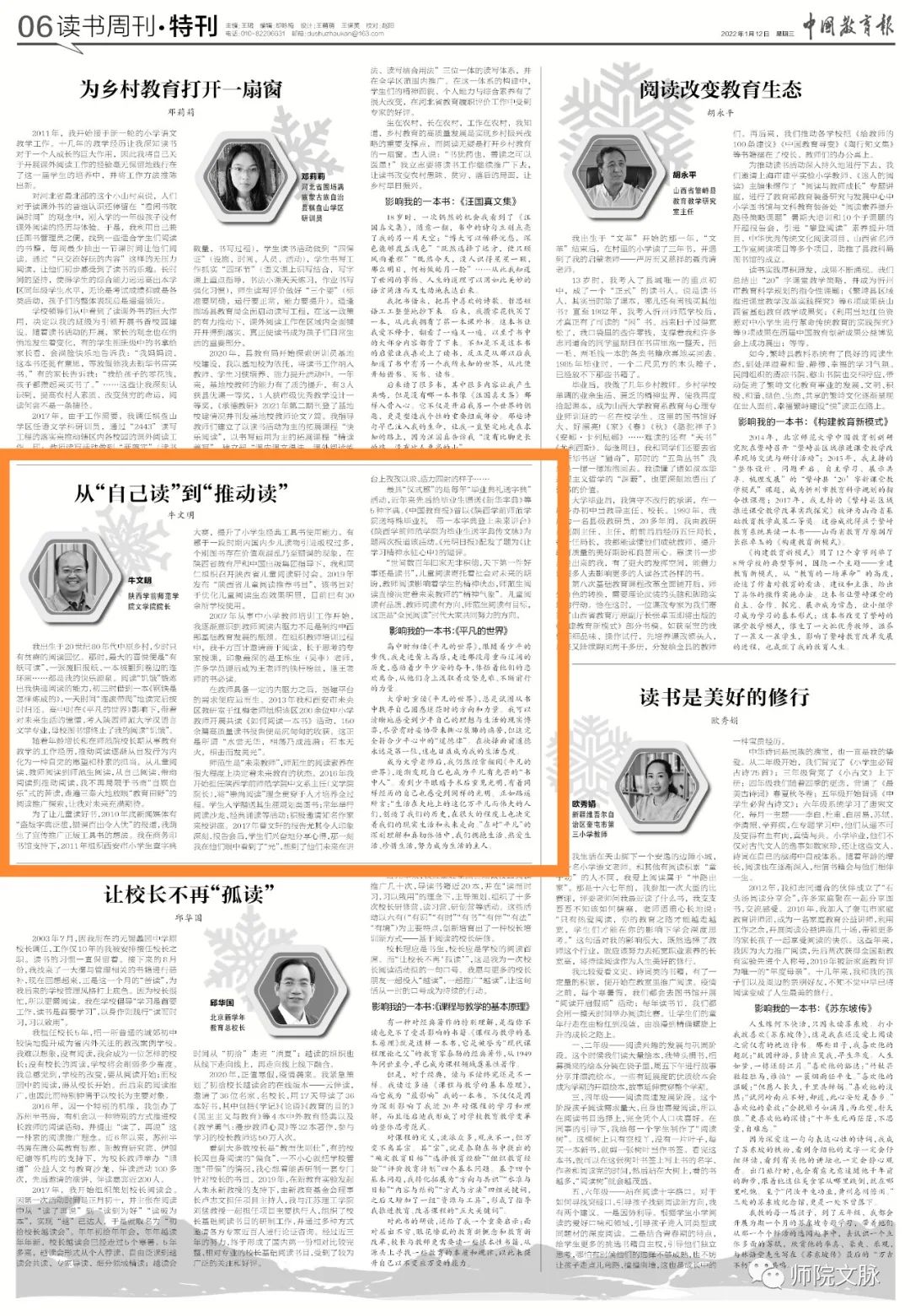 日前,《中国教育报》2021年度推动读书十大人物名单揭晓,文学院院长牛文明教授与北京市东城区灯市口小学校长滕亚杰等10位教育系统人士入选,该报在1月12日第6版以《从“自己读”到“推动读”》对牛文明教授的阅读推广活动进行了专题报道。