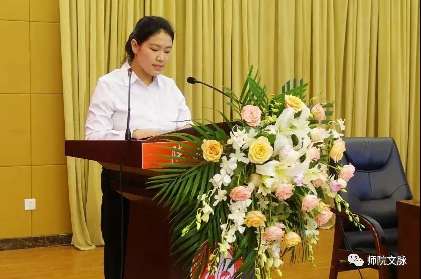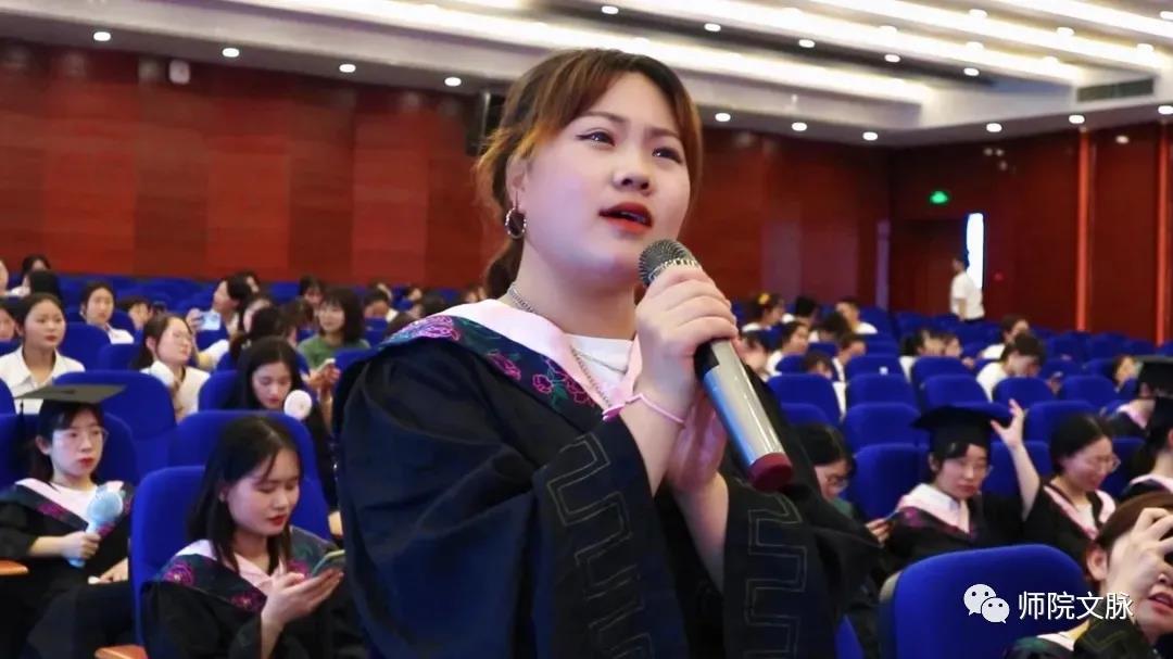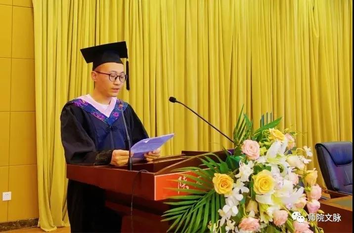 2021届汉语言文学专业常小龙、语文教育专业刘月代表毕业生发言。他们深情回忆了大学时光的点点滴滴,对母校、师长、同窗充满感恩之情,号召全体毕业生牢记“厚德博学”的校训和“文道合一,诚身乐业”的院训,做拥有智慧并富有激情的人,做胸怀大志并脚踏实地的人,做富有责任并敢于勇挑重担的人,不畏艰险、追求卓越,开创更加美好的未来。