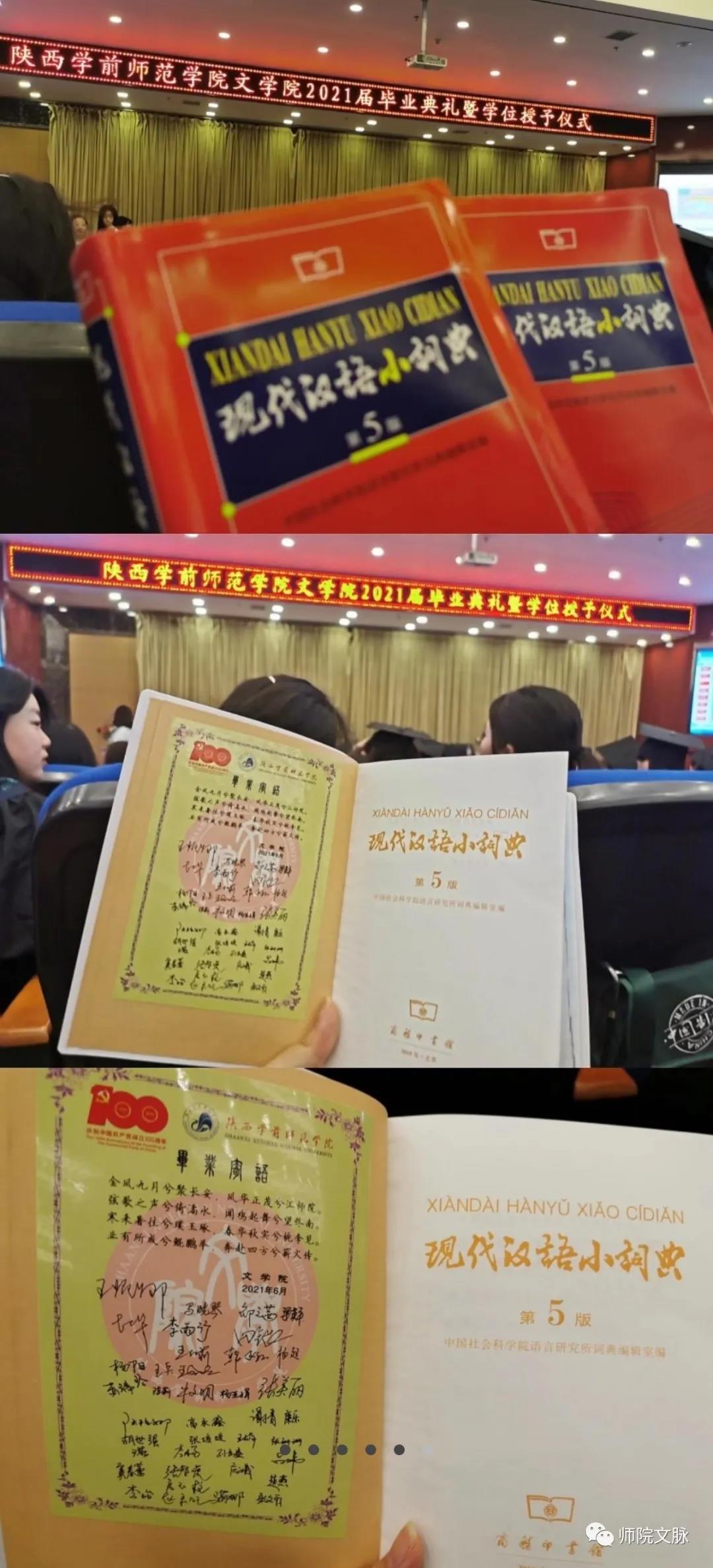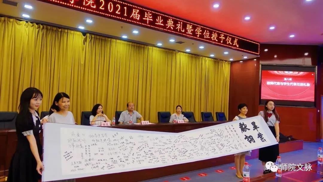 典礼现场,播放了未能参加典礼仪式的老师们的祝福视频,老师们熟悉的身影和温柔的话语,引起全场毕业生的欢呼,也让许多同学感动泪目。邵之茜教授、韩承红教授代表全体教师向毕业生代表赠送了文学院的毕业礼物——《现代汉语小词典》,凝聚了学院对毕业生的殷切期盼,希望他们能够在今后的职业生涯中,教学生写好中国字、说好中国话、讲好中国故事,做中华优秀传统文化的传承者和践行者。学生代表也向文学院回赠了一幅签满毕业生寄语的卷轴,表达了同学们对母校和文学院的深深依恋与祝愿。