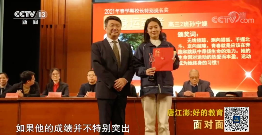 2006年,唐江澎开始担任这所有着百年历史名校的校长。他设立了校长特别提名奖,以此彰显教育的焦点。唐江澎为天天坚持跑步的同学发奖,即使他的成绩并不是特别突出。唐江澎为天天给父母打电话的孩子发孝心奖,他说父母培养一个让自己暖心的孩子,这是挺成功的事。