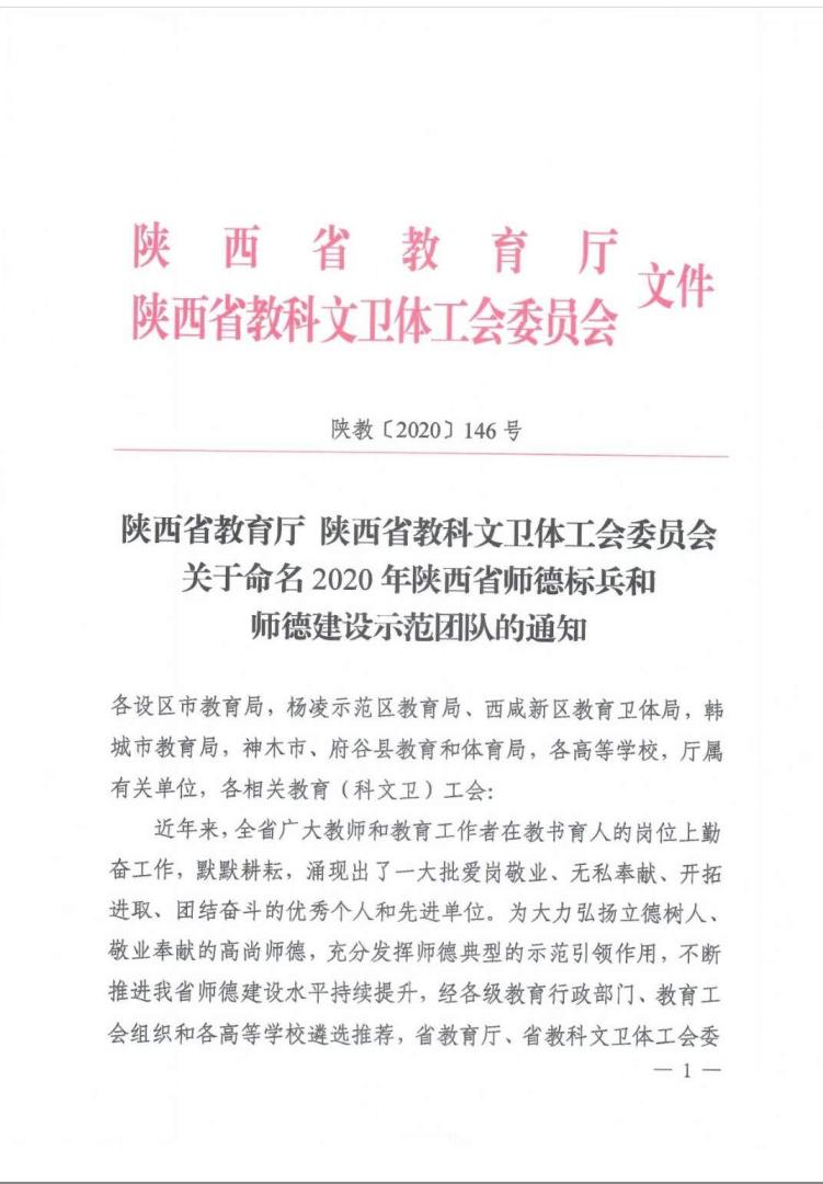 日前,陕西省教育厅、陕西省教科文卫体工会委员会下发《关于命名2020年陕西省师德标兵和师德建设示范团队的通知》(陕教【2020】146号),我院获评“陕西省2020年师德建设示范团队”称号。