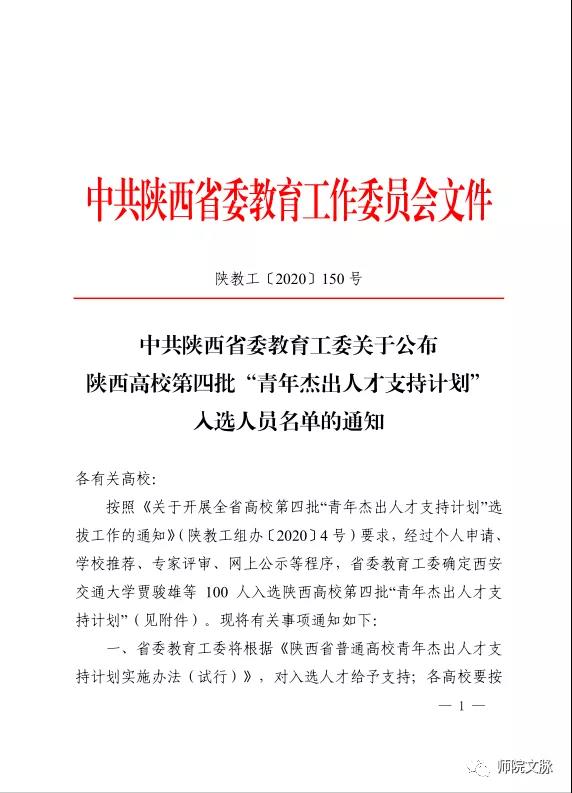 陕西高校“青年杰出人才支持计划”着眼于人才基础性培养和战略性开发,提升我省高教系统人才竞争力,采取定期选拔、年度考核、动态调整的模式,选拔和支持一批研发水平高、创新能力强、综合素质好、发展潜力大的优秀青年学术技术人才,为我省实现追赶超越提供强有力的人才支撑和智力支持。自2017年该计划实施以来,我院目前已有两位教师成功入选。