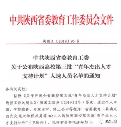 日前,中共陕西省委教育工委印发《关于公布陕西高校第三批“青年杰出人才支持计划”入选人员名单的通知》,文学院院长牛文明教授入选。