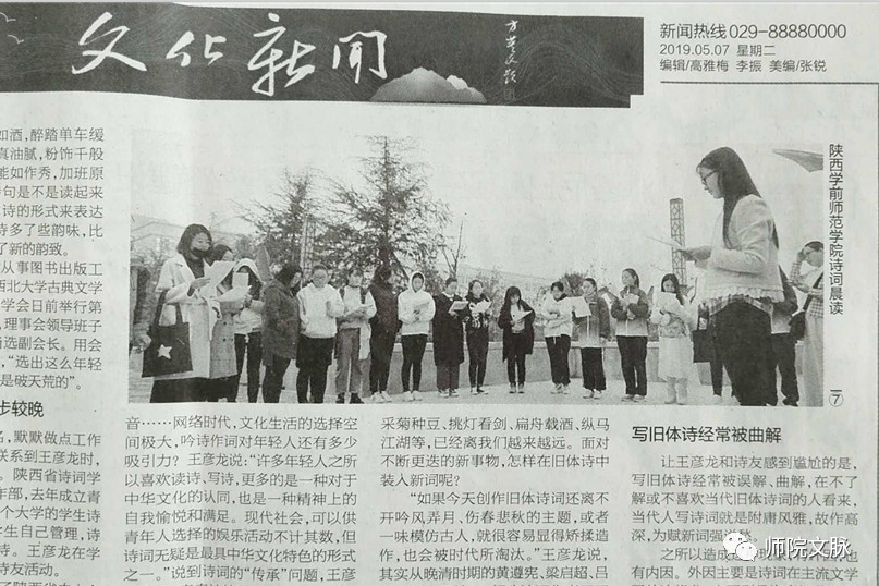 5月7日,《华商报》文化新闻版刊发了《90后的他们,把生活写进古典诗词》的专题报道,配发文学院墨韵诗社晨读照片,展示了文学院学生社团与学子风采,见证了学院学风建设的初步成效。