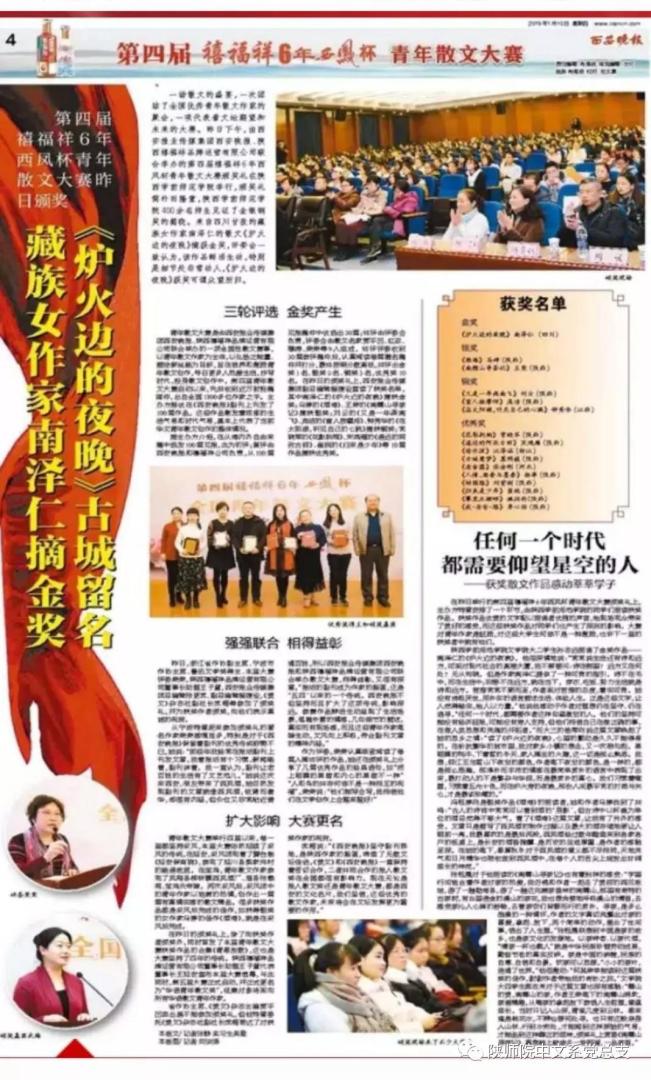 1月9日,由西安报业传媒集团西安晚报、陕西禧福祥集团主办的第四届青年散文大赛颁奖典礼在图书馆报告厅举行。我校副校长相艳,浙江省作协副主席荣荣,西安报业传媒集团总编辑张更武、副总编程建设,美文杂志社副社长武梅和陕西禧福祥品牌运营公司董事长助理王子童、工会主席王春雷及新华社、西部网等多家媒体嘉宾出席颁奖典礼。文学院领导牛文明、杨阳、赵燕及师生代表400余人参加活动,典礼由我院毕业生符音、廖佳玮主持。