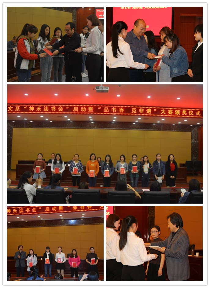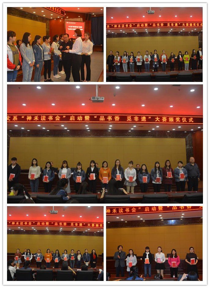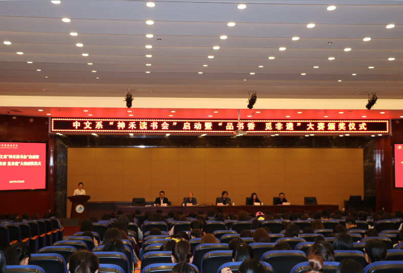 4月26日,中文系“神禾读书会”启动暨“品书香·觅非遗”大赛颁奖仪式在图书馆学术报告厅隆重举行。《各界》杂志主编远村、诗歌网总编何超锋、中文系党政领导、系辅导员及400余名师生代表参加了活动。大会由中文系党总支副书记孔养涛主持。