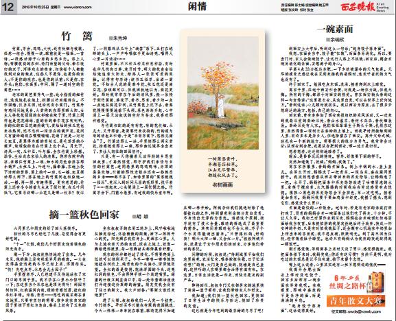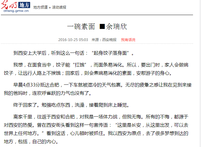 日前,中文系2015级汉语言文学专业学生余瑞欣散文作品《一碗素面》刊发于《西安晚报》2016年10月25日第12版。光明网、凤凰网等国内知名网站进行了转载。