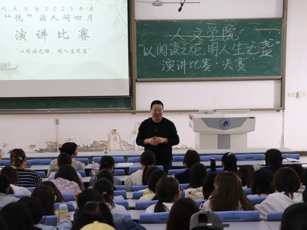 为进一步激发学生阅读热情,营造良好读书氛围,人文学院组织开展了2025年“悦读人间四月”读书月活动,4月16日下午,学院在一教C4阶梯教室举办了以“以阅读之炬,明人生之盏”为主题的演讲比赛决赛。本次比赛邀请了人文学院副教授赵录旺、陕艳娜、杨亚娟三位老师担任评委,共有120余名学生到场观看。
