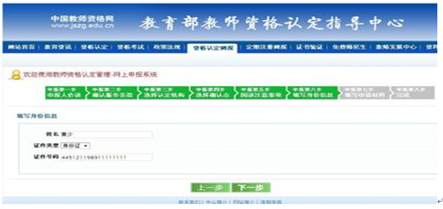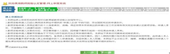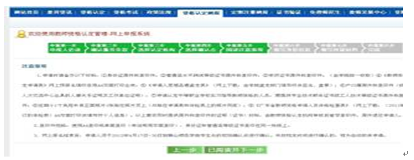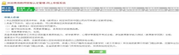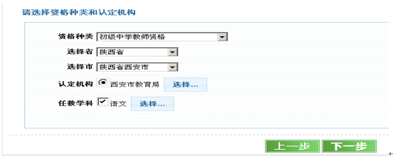 3.第三步在“资格种类”栏选择要申请的教师资格种类:(填写“初级中学教师资格”、“幼儿园教师资格(学前教育学生填写)、小学教师资格(初等教育学生填写)”,选择省“陕西省”,选择市“西安市”,选择认定机构是“西安市教育局”,任教学科选择与自己所学专业相同学科。填写完毕点击下一步