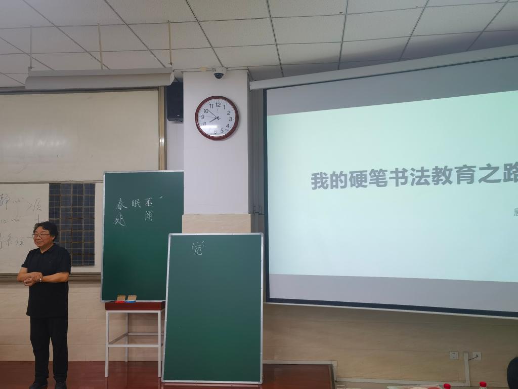 唐于山老师结合自己多年从事硬笔书法教育的经验,生动详实的讲解了如何成为一名汉字规范书写的师范生,他结合脍炙人口的唐诗《春晓》为学生现场展示书法写作要领。最后,他为参加讲座的部分同学赠送自己的书法作品。
