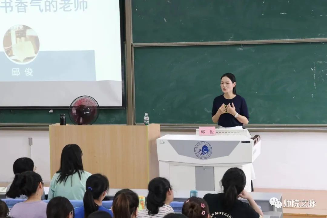 邱俊老师的报告围绕基础教育经历和亲身体会、教师阅读的重要性、新时代背景下如何做“有书香气”的教师等三个方面展开。她强调要“养成阅读习惯,掌握阅读方法,感受阅读魅力”,即从“读书,阅己”到“教书,悦己” 再到“写书,越己”。她指出,作为一名语文教师,在教学生阅读之前,自己要有充足的涵养和学识,保持对阅读的热爱,坚持读书才能“腹有诗书气自华”。邱老师讲述了自身教育经历,引导学生反思阅读问题并分享读书方法,阐明阅读在人的成长和进步中发挥着巨大作用。她勉励师范生要从阅读中学习知识并应用于实际生活,做到知行合一,养成“终身阅读”的习惯,未来成为优秀的语文教师。