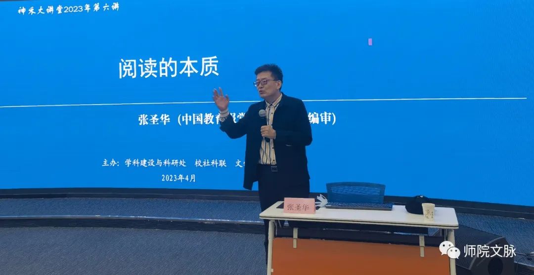 4月9日上午,“神禾大讲堂”2023年第六讲在积学楼师范生职业能力发展中心举行,《中国教育报》常务副总编张圣华应邀做题为“阅读的本质”的学术讲座。讲座由文学院院长牛文明教授主持,文学院副院长赵燕教授与全校近百名师范生参加了本次活动。