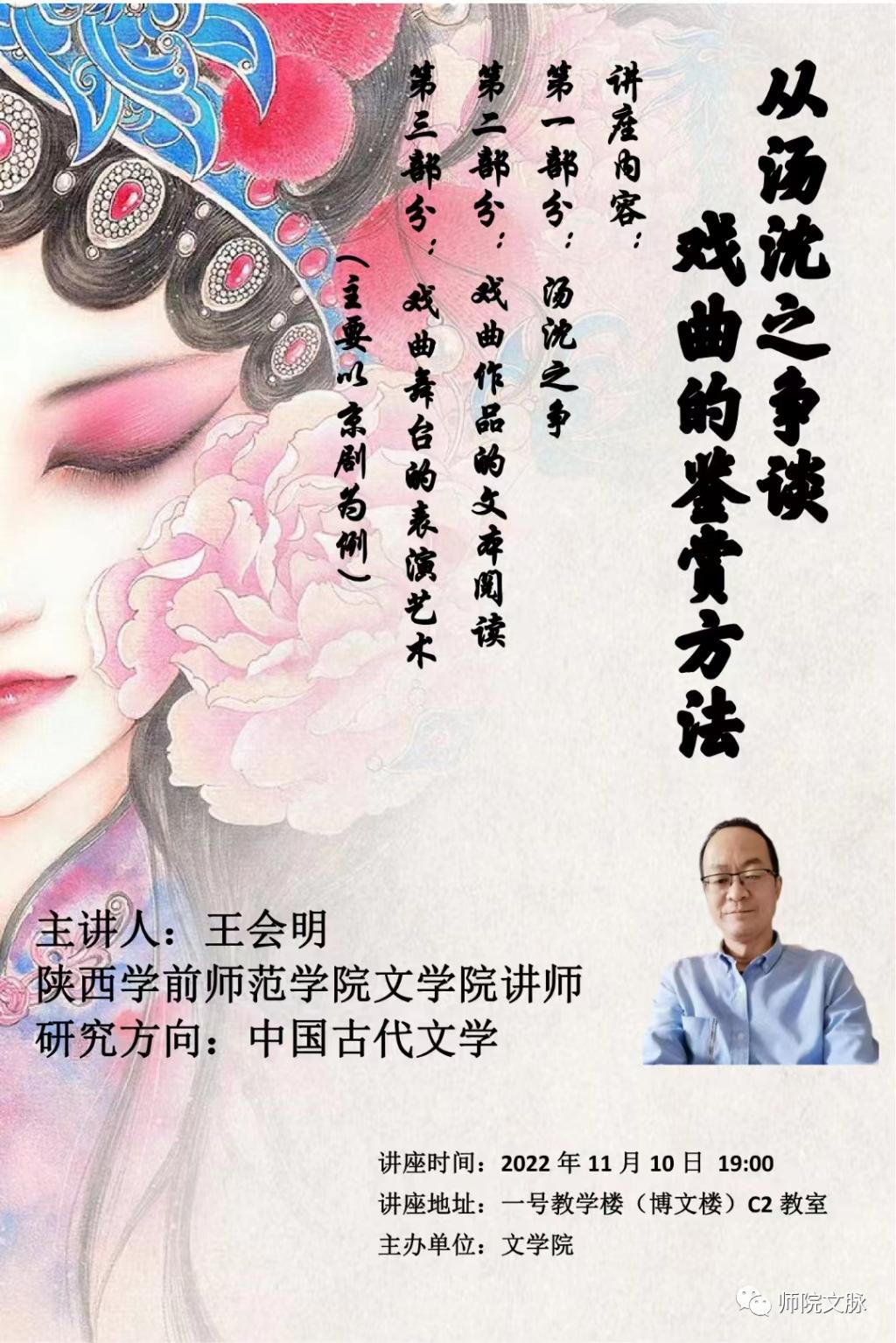 为深入贯彻落实立德树人根本任务,进一步提升学生的专业素养,营造良好的校园学术氛围,11月10日下午,文学院在博文楼C2教室举办学术报告会,邀请文学院王会明老师作题为“从汤沈之争谈戏曲的鉴赏方法”的学术报告,2020级汉语言文学专业百余名学生听取了此次报告。